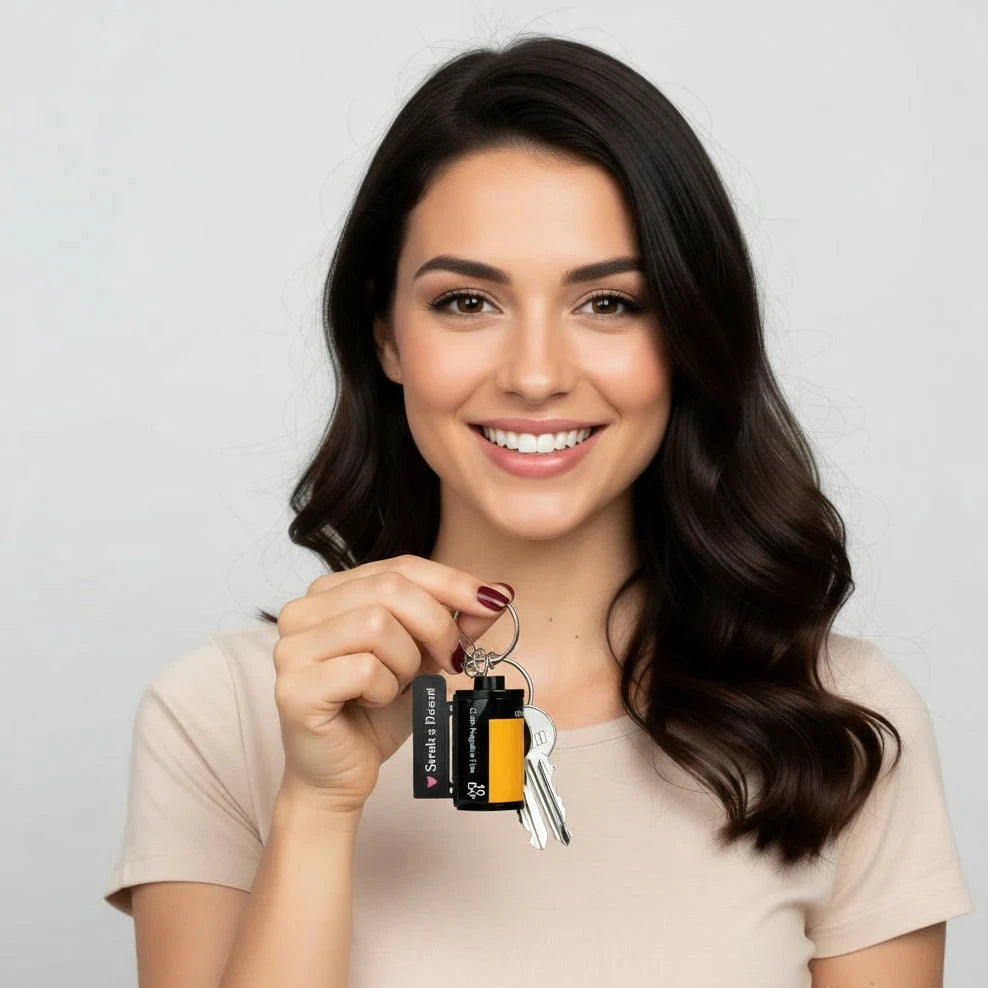 Oui ! Indiquez votre texte dans le champ “Donner un nom a votre porte-clé” lors de la commande. Il sera ajouté sur la pellicule.